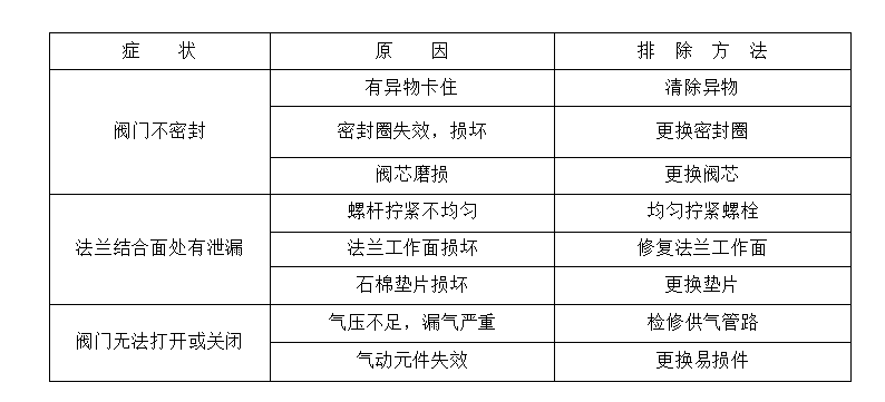 六、安裝使用要點 1)安裝前仔細閱讀本說明書,并核對閥門型號、通徑及技術參數(shù)。 2)嚴禁裝上閥門后施焊法蘭,以免損壞閥門密封圈。管道自先預留的閥門安裝距離應適應,法蘭兩邊加墊片。 3)兩管道中心與閥門通徑中心應保持同軸,法蘭面應平整,不允許法蘭面有較大的偏斜,以保證閥門的夾緊和正常工作。擰緊螺栓應做到均勻?qū)ΨQ。 4)該閥門出廠前已做調(diào)整和動態(tài)試驗,氣路已經(jīng)連接完好。 5)主要易損件為密封圈和閥芯。 七、常見故障及排除方法